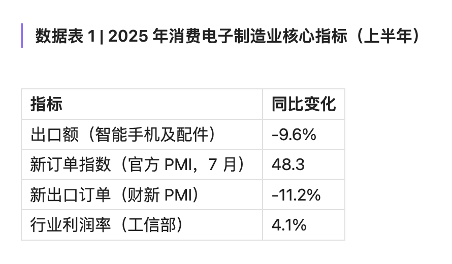 根据国家统计局与财新 PMI 数据,2025 年前 8 个月,中国制造业 PMI 新订单指数连续低于荣枯线。官方制造业 PMI 新订单指数在 7 月跌至 48.3,为 2020 年疫情以来最低水平;财新 PMI 报告显示,消费电子相关行业的新出口订单同比下滑 11.2%。与此同时,海关总署数据显示,2025 年上半年中国对欧美的智能手机及配件出口额同比下降 9.6%。