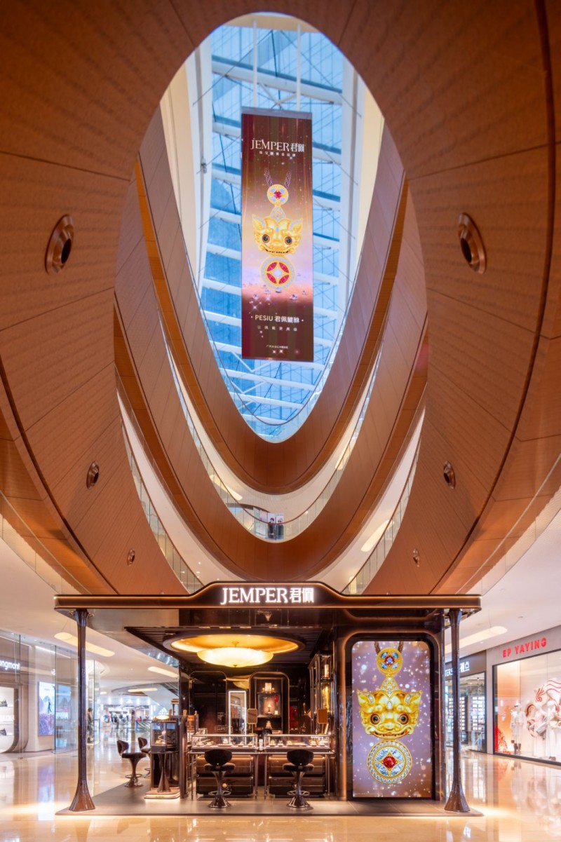 君佩的扩张之路,始终伴随着对顶奢商场的严格筛选。这并非简单的规模拓展,而是一种精准的品牌宣言:只在高净值人群聚集处,呈现珠宝级黄金的美学与价值。太古汇汇聚了广州乃至大湾区的企业家、企业高管与精英阶层,其客群与君佩所定位的东方新贵——那些对黄金有高审美、高品质需求的人群高度重叠。在这里,店铺不再只是销售终端,而是品牌与客群对话的精神场域。君佩的门店设计与商场整体调性深度融合,以静谧、高级的空间语言,传递出东方新奢的现代气质,让黄金脱离传统柜台的束缚,成为生活方式的一部分。